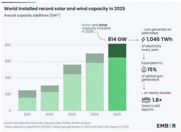 2026년 3월 20일 기준, 글로벌 에너지 싱크탱크 Ember에 따르면 2025년 전 세계에서 신규로 설치된 태양광 및 풍력 설비 용량은 81…